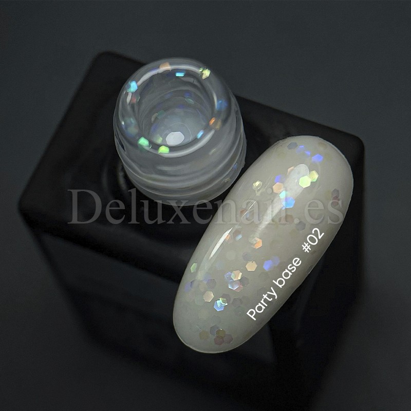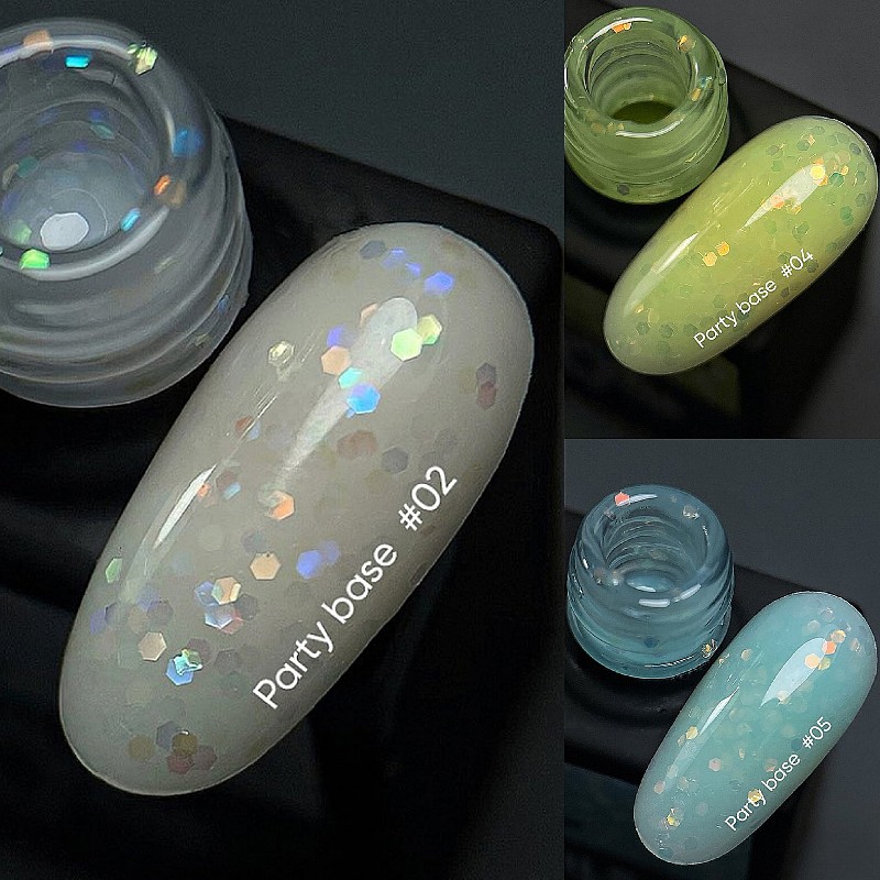Party Base es una colección brillante y veraniega de tonos preciosos y delicados, que contienen hexágonos holográficos de alta calidad. Son las bases camuflajes autonivelantes y elásticas de consistencia media.