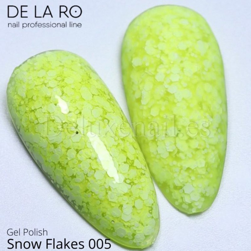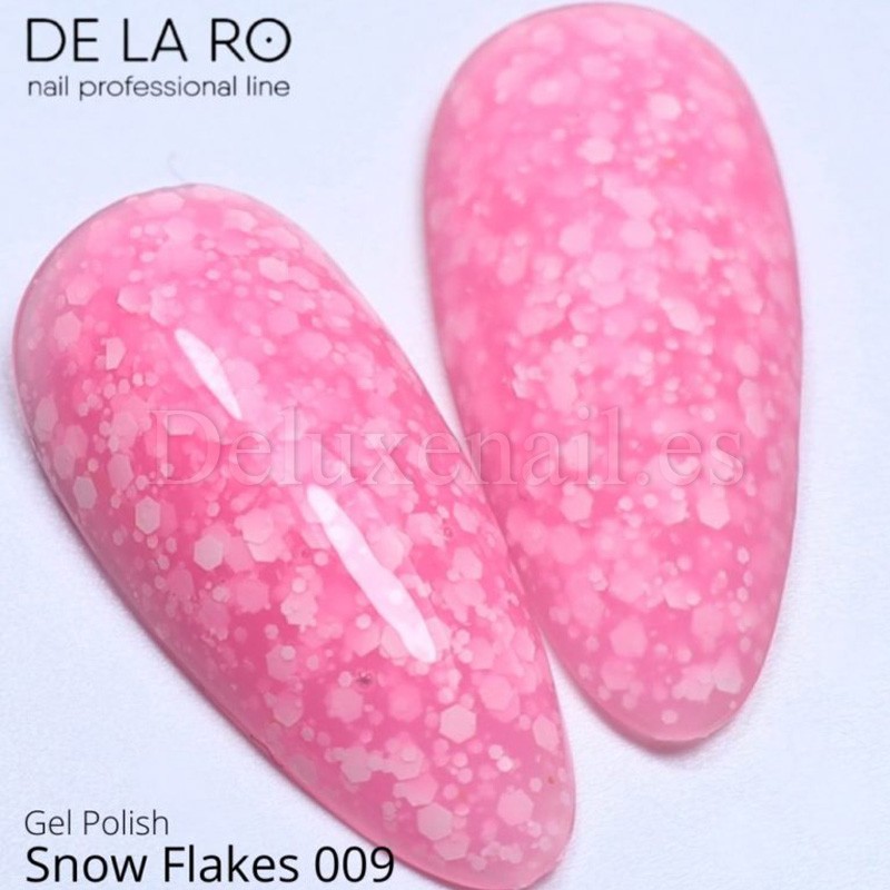 Los esmaltes Snow Flakes DE LA RO son 12 esmaltes permanentes traslucidos con hexágonos blancos de diferentes tamaños.