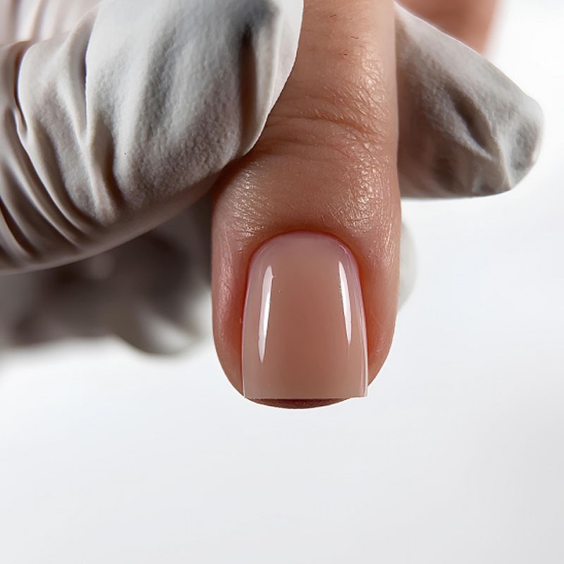 - nivelar la placa de la uña, aplicar una capa fina de Gel y, sin secarla, coger una gota de Gel de tamaño medio y distribuirla formando la estructura de la uña. Esperar 2-3 segundos para que el Gel se nivele (es aconsejable dar la vuelta al dedo por unos segundos).