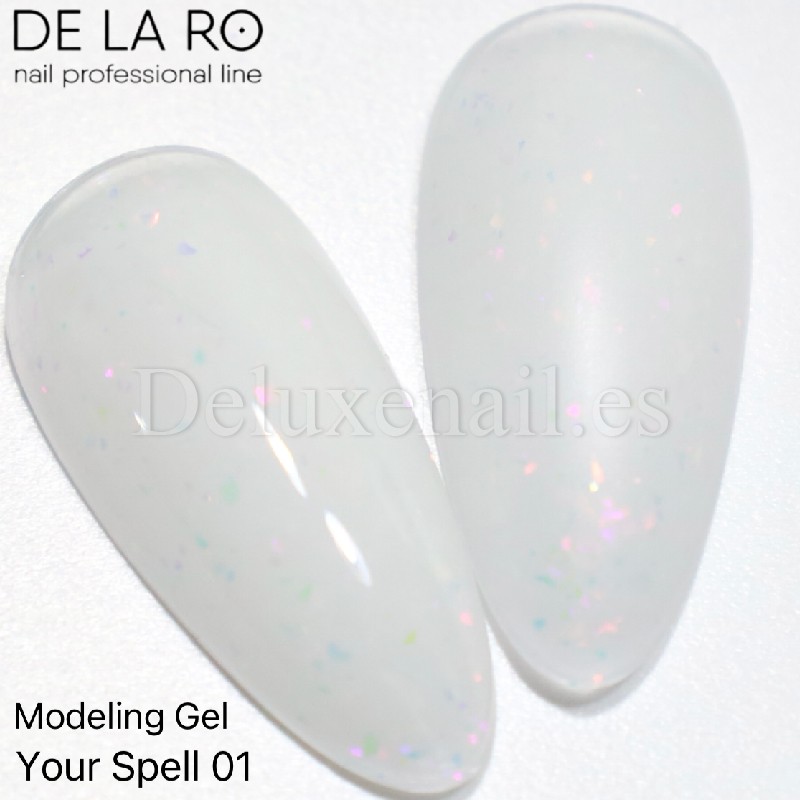 El Gel Constructor Monofásico Your Spell DE LA RO es un gel duro camuflaje con pequeños trozos de foil de diferentes colores con efecto ópalo.